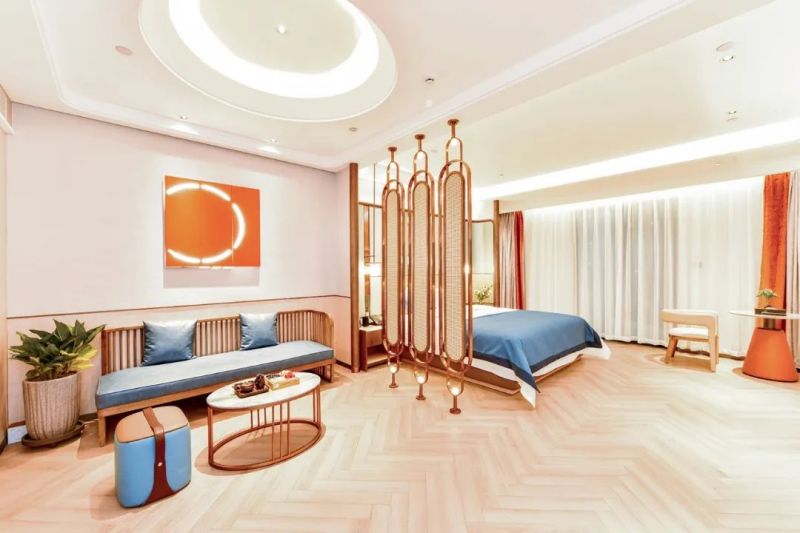 空間裝飾融入江門新會陳皮文化,以橙色為基調,搭配典雅的藍色床品,沉穩與熱情交織,帶來的獨特的視覺效果。