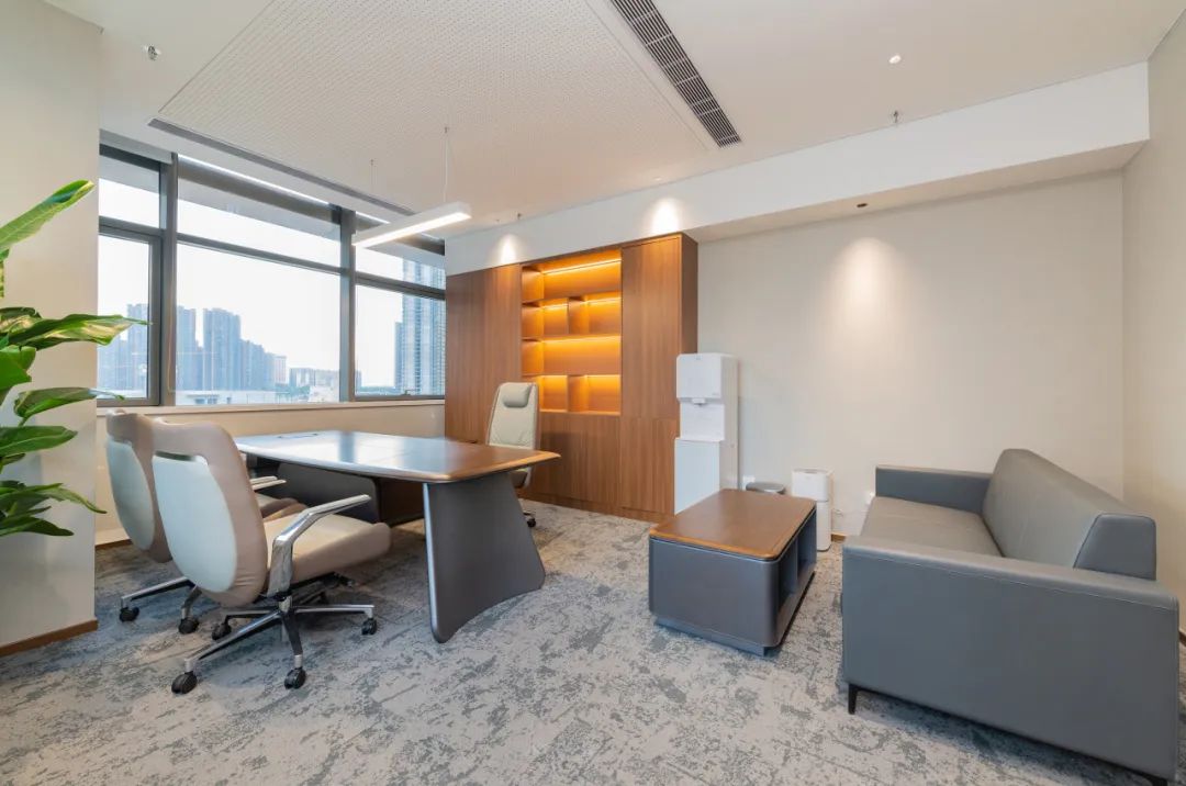 獨立辦公室的家具配色方案亦是極簡大氣。因此,在材質和配色選擇上使用了皮革和高級灰調,去塑造一個優雅高端的品質空間。